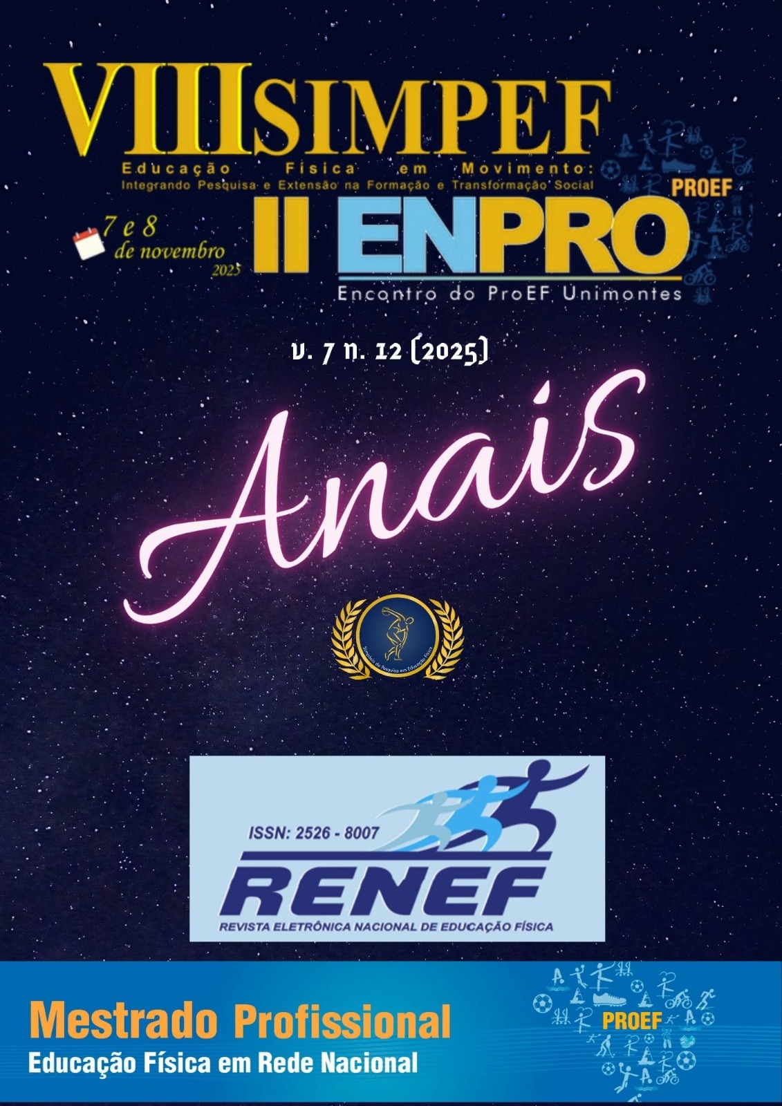 Vol. 7 No. 12 (2025)É com imensa satisfação que apresentamos os Anais do VIII SIMPEF (Simpósio de Pesquisa em Educação Física) e do II ENPRO (Encontro do ProEF Unimontes), realizados nos dias 07 e 08 de novembro de 2025, no Campus Universitário de Montes Claros, promovidos pelo Departamento de Educação Física e do Desporto da Universidade Estadual de Montes Claros – UNIMONTES. O evento reuniu mais de 100 participantes, entre especialistas, pesquisadores, estudantes e profissionais da área, consolidando-se como um importante espaço de diálogo científico e troca de experiências acadêmicas.